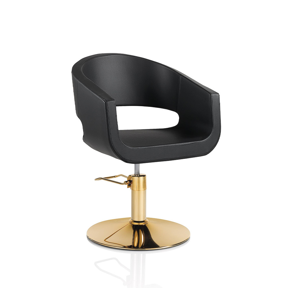 Objavte dokonalé spojenie štýlu a funkčnosti s našim elegantným kaderníckym kreslom, ktoré je potiahnuté čiernym ekologickým kožom. Jeho moderný dizajn a zlatý chrómový otočný podstavec dodajú vášmu salónu prestížny vzhľad.